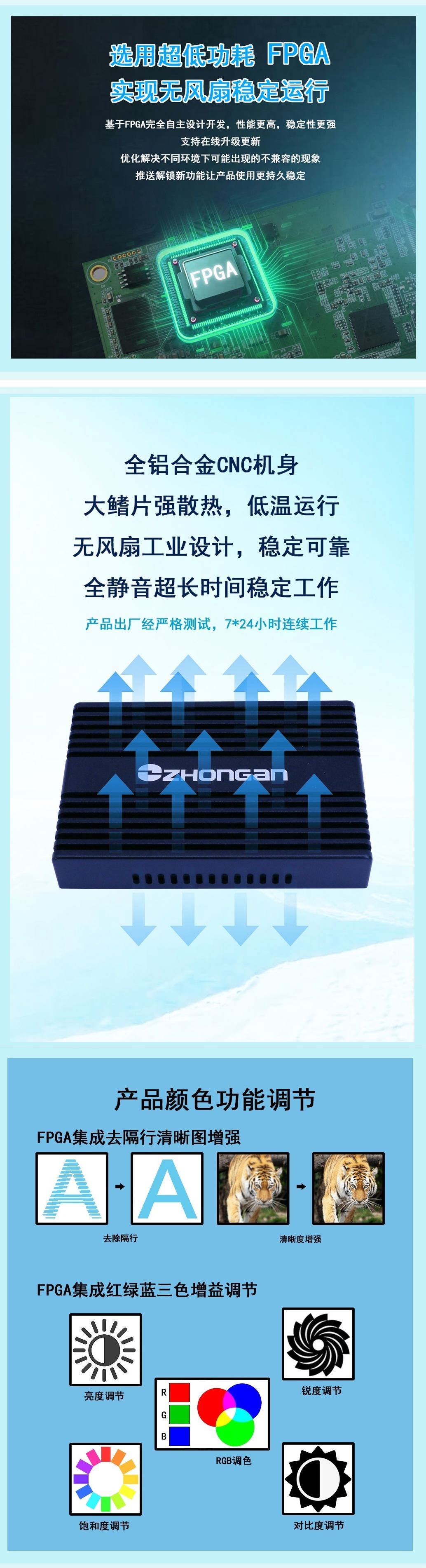 產品特性 | 采用Lattice Fpga完全自主設計開發 采用TYPE-C接口,采用UVC設計不需安裝驅動即插即用 支持一路4K 60fps HDMI輸入和一路4K 60fps HDMI環通輸出 1個line in模擬音頻輸入 和一路音頻輸出 采用超低功耗設計,設備運行完全不發熱保證7×24小時穩定運行。 FPGA集成高質量運動預估自適應去隔行算法 FPGA集成高質量雙線性圖像縮放算法,可實現多級高質量圖像縮放 FPGA集成高精度色彩空間轉換算法,支持RGB24、NV12、YUV422格式輸出 FPGA集成亮度,對比度,飽和度,和清晰度增強算法,實現多級色彩調節。 FPGA集RGB紅綠藍三色單獨增益調節,更精細化調節色差風格 FPGA集成音頻重采樣和音頻混用算法 支持標準Windows DirectShow和linux V4L2架構及支持流媒體采集 |